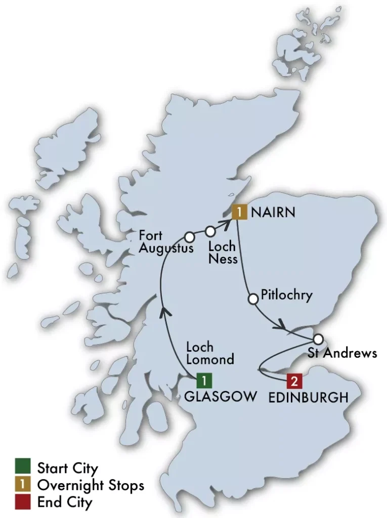 Your excursion begins from your Glasgow hotel at 2:00 PM. Embark on a comprehensive tour of this vibrant and welcoming city, renowned for its Victorian architecture and contemporary culture. Explore George Square, adorned with monuments to renowned Scots. Visit the Kelvingrove Art Gallery and Museum, an exquisite Spanish Baroque-style structure showcasing one of Europe’s premier art collections, featuring works by Rembrandt, Titian, and Dali. Conclude the day with a welcome drink and dinner with your group.